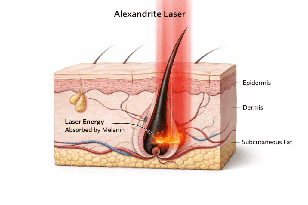Este láser emite un haz de luz que es absorbido por la melanina del vello, generando calor que destruye el folículo piloso sin dañar la piel circundante. Como tiene una longitud de onda más corta que el láser diodo, su efecto es más superficial pero también más preciso.
